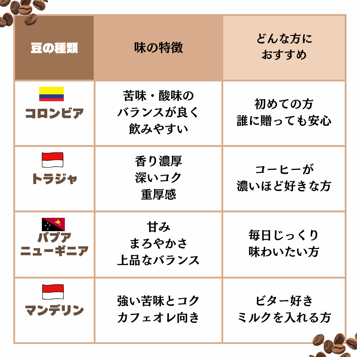 ご自宅で気軽に“世界のコーヒー”を楽しめる、人気のお楽しみセット。コロンビアやブラジル、キリマンジャロ、マンデリン、モカマタリなど、個性豊かな9種類のシングルオリジンからお好きな豆を2種類選べます。旅行気分で飲み比べができる、コーヒー好きにはたまらないセットです。